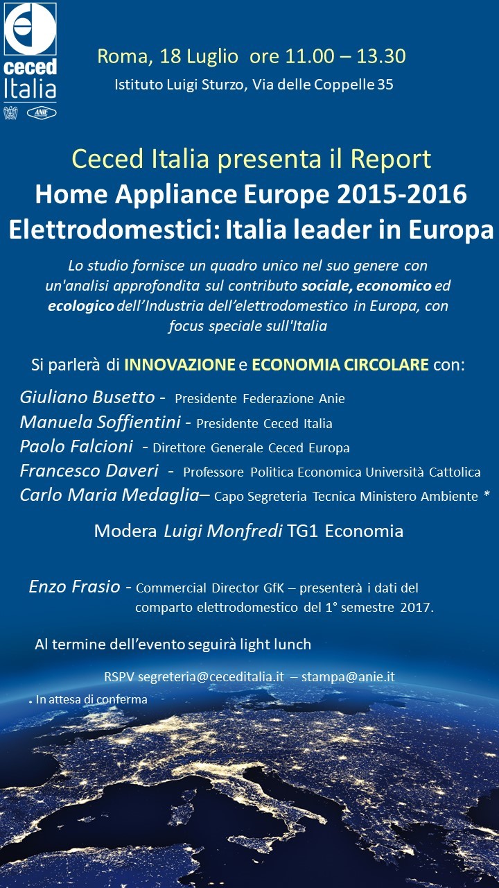 Sul tema si esprimeranno Giuliano Busetto, Presidente di Federazione ANIE; Manuela Soffientini, Presidente di CECED Italia, Paolo Falcioni, Direttore Generale di CECED Europa e Francesco Daveri, Ordinario di Politica Economica presso l’Università Cattolica di Piacenza.